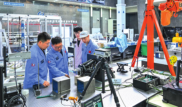 中國科學院空間光學系統(tǒng)在軌制造與集成重點實驗室副主任徐振邦(左二)與同事在實驗室內討論科研工作(2023年5月25日攝) 許暢攝 / 本刊