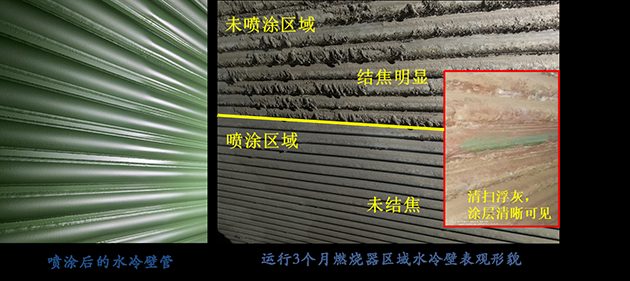 噴涂防護(hù)材料的受熱面就像穿了一件“鋼鐵鎧甲”,阻隔了外部腐蝕介質(zhì)的侵入,減少了鍋爐高溫?zé)煔庵腥廴谖飳?duì)管壁的黏附,保護(hù)水冷管壁表面不受結(jié)焦、高溫腐蝕的影響;并且涂層與基材具有匹配的導(dǎo)熱率和熱膨脹系數(shù),不影響鍋爐的傳熱效率以及使用壽命。同時(shí),防護(hù)材料還具有的紅外輻射功效,可強(qiáng)化爐膛內(nèi)輻射傳熱,降低爐膛出口煙溫;強(qiáng)化燃燒,提高煤粉的燃盡率,降低煤耗、提高煤種的適應(yīng)性。