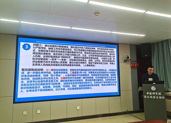 宣傳委員祁振軍向全體黨員通報了《中共中國科學(xué)院西北高原生物研究所委員會2024年度黨員領(lǐng)導(dǎo)干部民主生活會征求意見整改措施》。