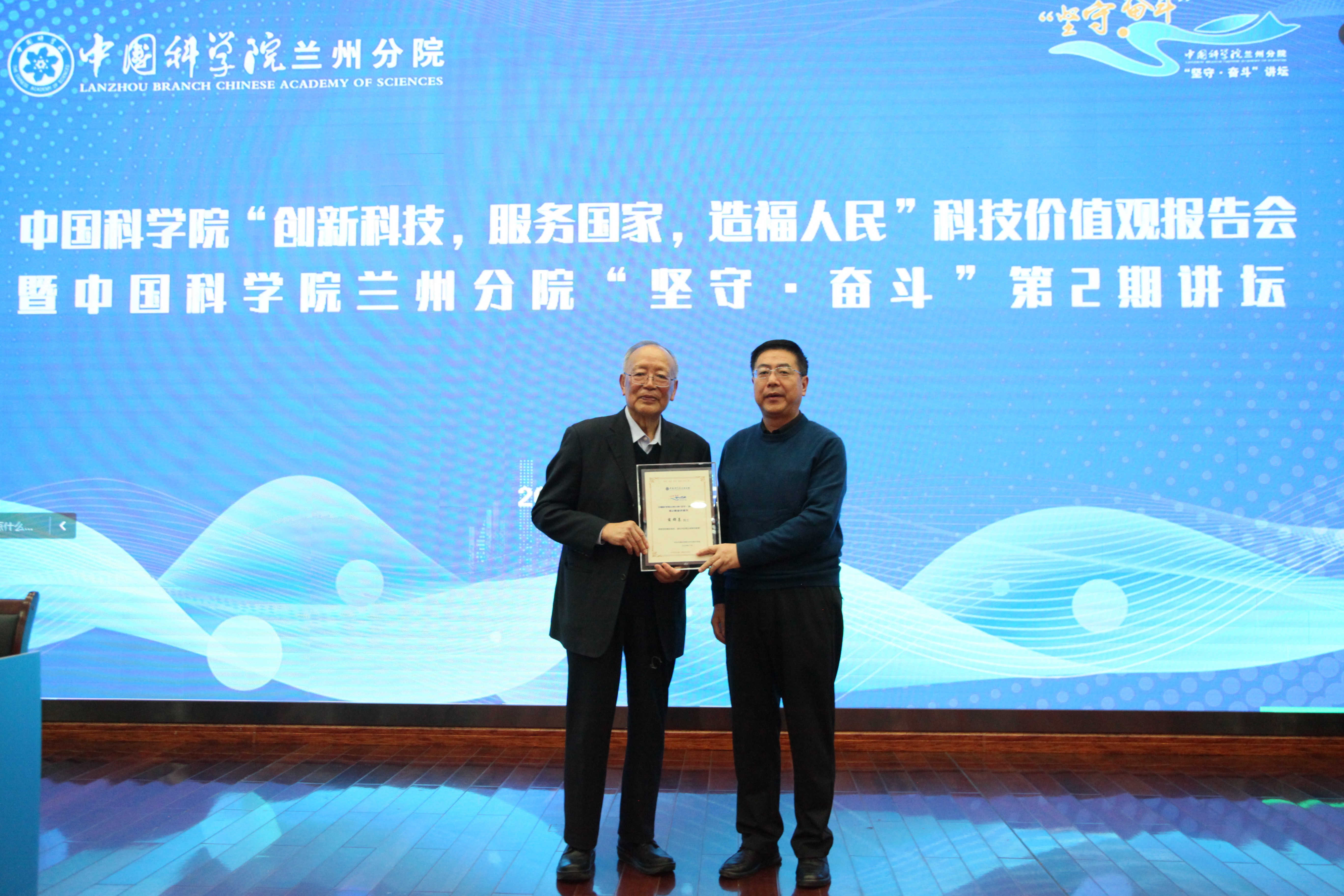 蘭州分院分黨組成員、紀檢組組長吳建剛為薛群基院士頒發(fā)宣講證書,并號召分院系統(tǒng)科研人員和研究生向以薛群基院士為代表的老一輩科學(xué)家們學(xué)習(xí),用實際行動詮釋心系“國家事”、肩扛“國家責”,把科學(xué)家精神融入實驗操作、體現(xiàn)在學(xué)術(shù)論文、貫穿于科研項目始終。蘭州分院分黨組也將繼續(xù)大力支持“堅守·奮斗”講壇、科學(xué)家精神基地和黨員主題教育基地等平臺建設(shè),大力弘揚科學(xué)家精神,積極宣傳先進典型,為搶占科技制高點營造良好的科研氛圍。