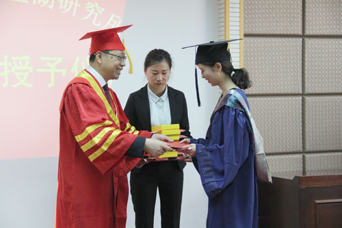畢業(yè)典禮在與會(huì)人員集體奏唱國歌聲中拉開序幕。主持工作的副所長吳志堅(jiān)代表所領(lǐng)導(dǎo)發(fā)表講話,對2017屆畢業(yè)生表示衷心地祝賀,對今后的發(fā)展提出了四個(gè)“好”:思想好、身體好、學(xué)習(xí)好、工作好。殷切期望畢業(yè)生能有一個(gè)積極、樂觀、不斷進(jìn)取的健康思想,能夠積極進(jìn)行體育鍛煉,保持健康身體,能夠在今后的道路上不斷學(xué)習(xí),成為今后工作崗位上的棟梁之才,能夠積極應(yīng)對工作中遇到的各種情況,對工作富有熱情。吳志堅(jiān)還宣讀了中國科學(xué)院大學(xué)丁仲禮校長給2017屆畢業(yè)生的一封信,希望畢業(yè)生擔(dān)負(fù)起丁仲禮校長所給予的厚望。