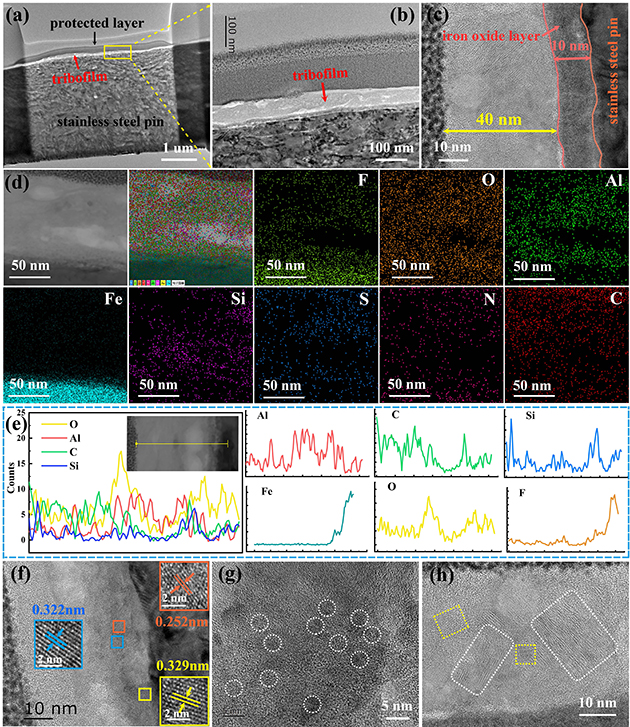 研究人員對(duì)摩擦膜進(jìn)行了深入分析,認(rèn)為微膠囊主要以鋪展-吸附和摩擦化學(xué)兩種機(jī)制發(fā)揮抗摩效應(yīng)。摩擦過(guò)程中層狀硅酸鹽進(jìn)入摩擦界面,發(fā)生解離、破碎和片層滑移,吸附或填補(bǔ)到摩擦副表面;在機(jī)械研磨和摩擦熱作用下對(duì)偶鋼表面大量Fe被活化,HNTs晶體破壞產(chǎn)生的活性基團(tuán)Si-、-Si-O-、-Mg-OH和活性Fe間接形成Si-O-Fe,Mg-O-Fe金屬陶瓷相,[HMIm][NTf2]所含活性元素F、S和活性Fe反應(yīng)形成FeF2和FeS,以及生成的鐵氧化物如Fe2O3、Fe3O4和FeO等共同存在于摩擦膜中,提高了復(fù)合材料的耐磨性。