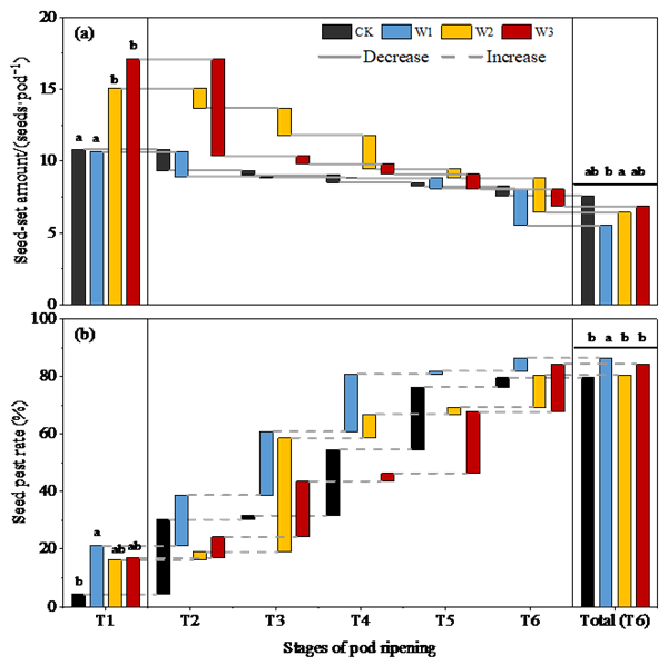 圖3 不同增溫處理下果熟期不同階段小葉錦雞兒(a)結種量和(b)蟲害率