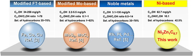 圖1.CO2加氫制備C2+OH的多相催化劑及其性能比較