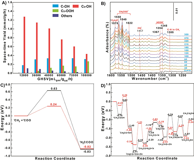 圖4.(A)不同空速條件下的催化性能; (B)原位DRIFTS監(jiān)測反應(yīng)過程;DFT模擬C-C偶聯(lián)過程(C)與*CH3COO加氫形成CH3CH2OH過程(D),