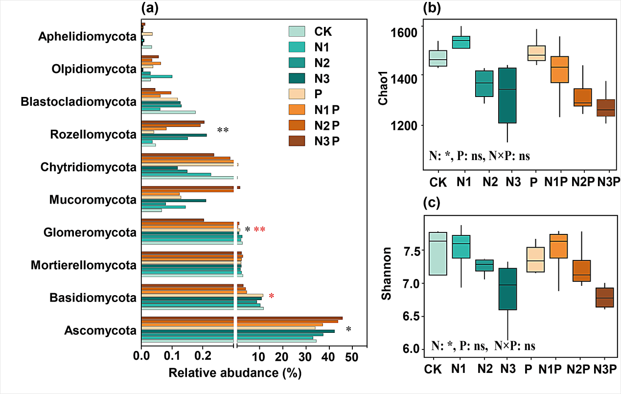 圖1 氮和磷添加對優(yōu)勢真菌類群相對豐度 (a)、真菌 Chao1 豐富度 (b) 和真菌Shannon多樣性 (c) 的影響。 (a)中的黑色和紅色*分別表示氮添加和磷添加的影響。 (b,c) 中的 N、P 和 N × P 顯示了氮添加和磷添加及其交互作用對真菌群落多樣性的影響。