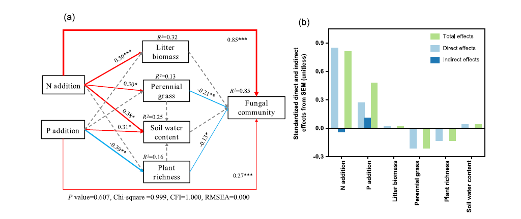 圖3 結(jié)構(gòu)方程模型描述了氮添加和磷添加對真菌群落結(jié)構(gòu)的直接和間接影響