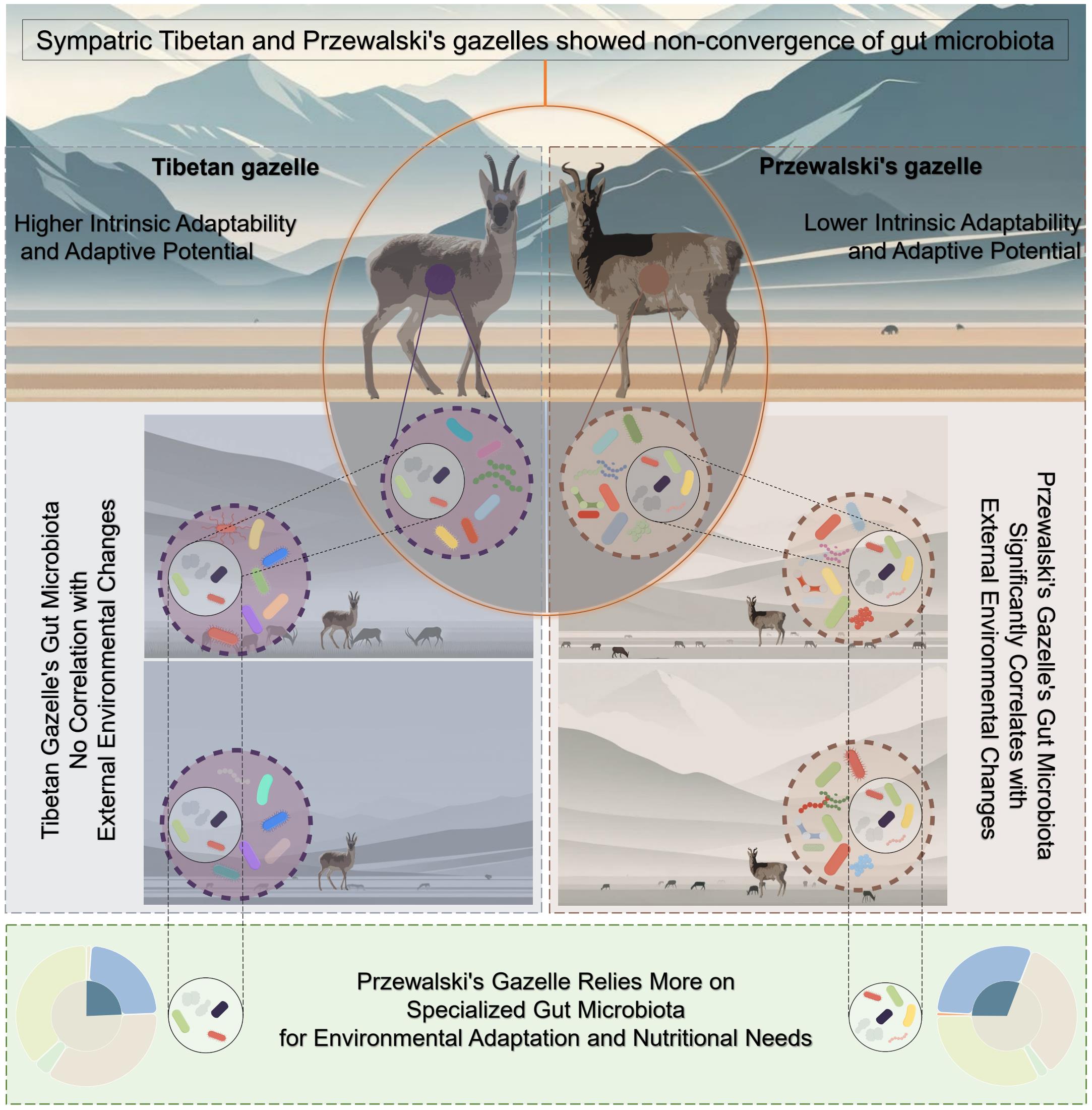 為闡明宿主瀕危程度與腸道微生物依賴性之間的關(guān)系,中國科學(xué)院西北高原生物研究所動物生態(tài)與資源保護(hù)研究團(tuán)隊以藏原羚(近危)和普氏原羚(瀕危)為研究對象,通過16S rRNA擴(kuò)增子測序技術(shù)進(jìn)行高通量測序,深入探究了這兩個物種在相同和不同環(huán)境條件下的腸道微生物多樣性和組成,群落組裝機(jī)制以及預(yù)測功能的變化。研究結(jié)果表明,相較于異域分布的種群,同域分布的藏原羚和普氏原羚種群的腸道微生物多樣性和組成并未因共享相同環(huán)境而呈現(xiàn)顯著的趨同。進(jìn)一步分析發(fā)現(xiàn),藏原羚和普氏原羚腸道微生物與宿主外部環(huán)境變化的關(guān)系存在明顯的區(qū)別,瀕危等級更高的普氏原羚腸道微生物群落結(jié)構(gòu)變異與環(huán)境條件的改變顯著相關(guān),而在瀕危等級較低的藏原羚中,這種相關(guān)性則不顯著。利用iCAMP對兩物種腸道微生物群落的組裝過程進(jìn)行定量分析,結(jié)果顯示普氏原羚腸道微生物群落的組裝過程相比藏原羚更偏向于同質(zhì)選擇過程(HoS)。對促進(jìn)這一轉(zhuǎn)變的微生物類群進(jìn)行分析,發(fā)現(xiàn)在普氏原羚中貢獻(xiàn)了同質(zhì)選擇,但在藏原羚中貢獻(xiàn)了其他過程(如隨機(jī)漂變、擴(kuò)散限制、異質(zhì)分散或異質(zhì)選擇)的ASVs主要隸屬于顫螺旋菌科、coprostanoligenes group、克里斯滕森菌科、阿克曼氏菌科和拉克諾斯菌科。對這些ASVs進(jìn)行功能預(yù)測及KEGG富集分析,結(jié)果表明,其主要與營養(yǎng)物質(zhì)代謝、合成以及免疫調(diào)節(jié)密切相關(guān),提示這些ASVs可能在宿主營養(yǎng)物質(zhì)利用和免疫功能維持等方面發(fā)揮著重要作用。研究認(rèn)為瀕危等級較高的普氏原羚更依賴腸道微生物所提供的“生態(tài)系統(tǒng)服務(wù)”以應(yīng)對環(huán)境的變化。這種依賴性可能源于瀕危物種通常適應(yīng)性和適應(yīng)潛力較低,腸道微生物在其適應(yīng)和應(yīng)對環(huán)境變化中發(fā)揮了重要的補償作用。本研究在揭示宿主瀕危程度與腸道微生物依賴性的關(guān)系的同時,也為瀕危物種保護(hù)和管理提供了新的視角和策略。