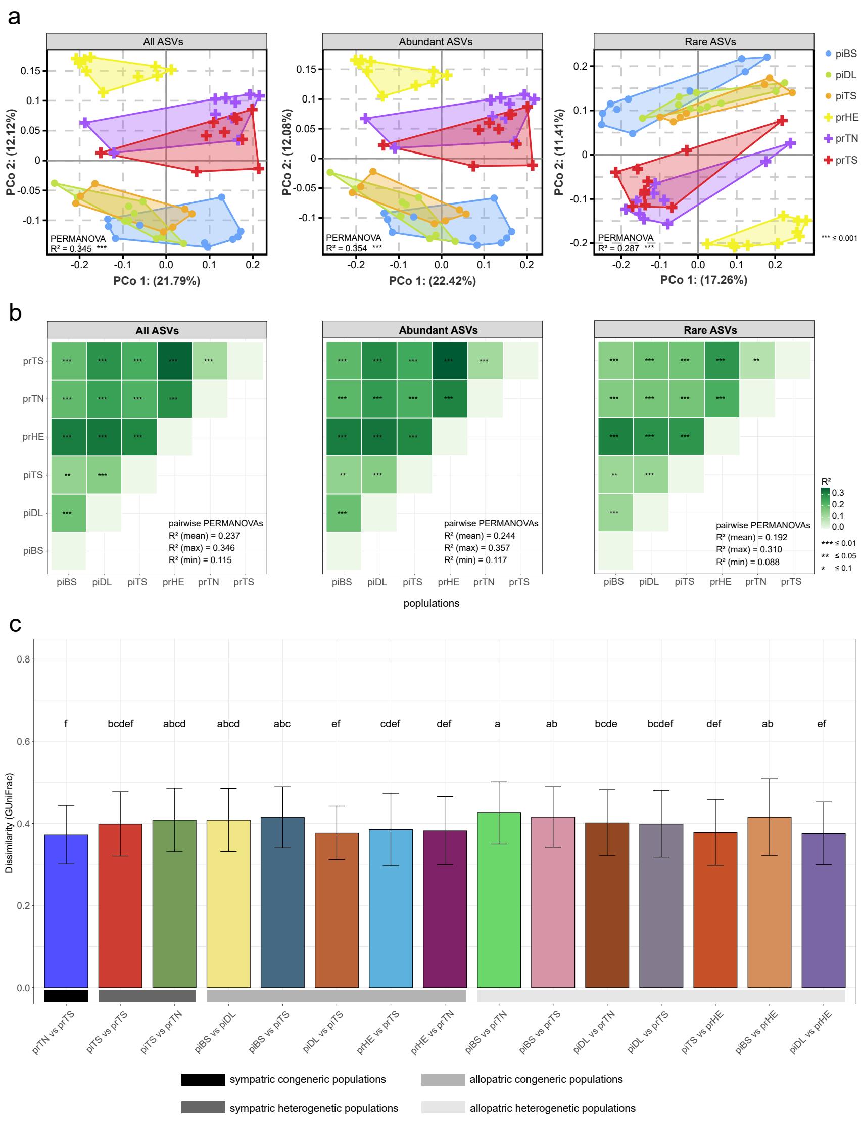 同域分布著的原羚種群相較于異域分布著的種群其腸道微生物未發(fā)現(xiàn)顯著的趨同(a)基于GUniFrac距離的藏原羚和普氏原羚不同種群腸道微生物PCoA分析;(b)藏原羚和普氏原羚種群腸道微生物β-多樣性組間差異熱圖;(c)藏原羚和普氏原羚同域、異域分布種群腸道微生物相異性條形圖