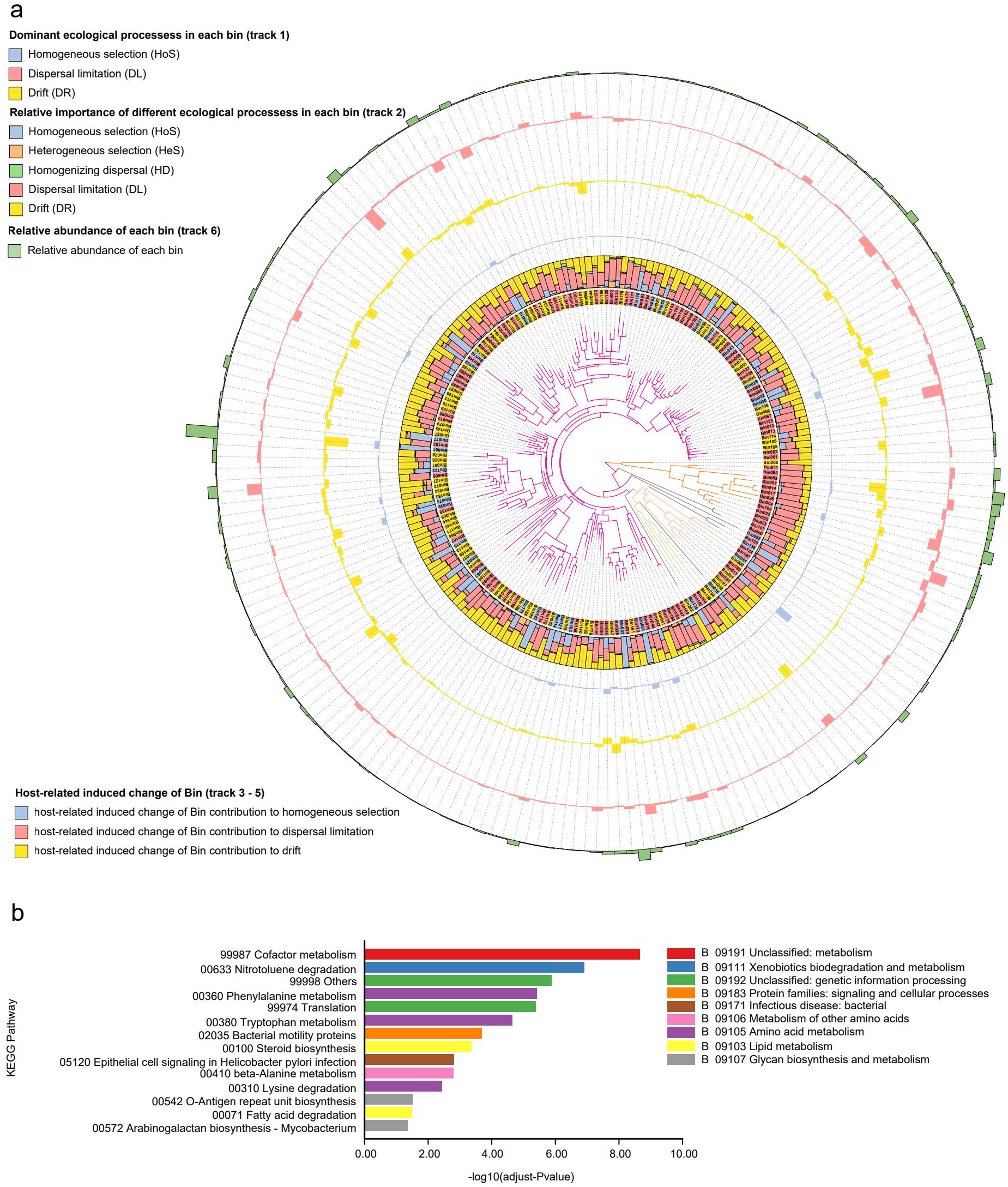 藏原羚和普氏原羚腸道微生物不同系統(tǒng)發(fā)育分箱的生態(tài)學(xué)組裝過程(a)及在普氏原羚腸道微生物中貢獻(xiàn)了同質(zhì)選擇過程而在藏原羚中卻貢獻(xiàn)了其他生態(tài)學(xué)組裝過程的ASVs集合所進(jìn)行的KEGG富集分析(b)