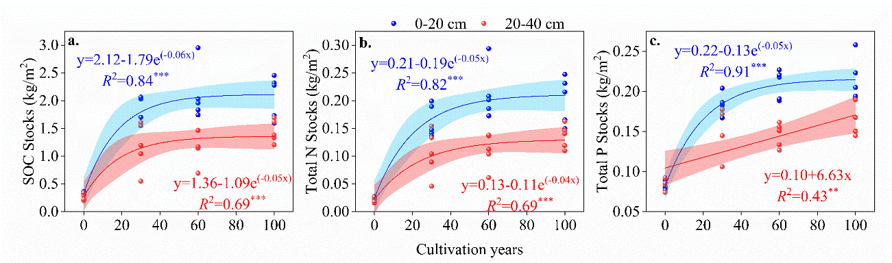 中國科學(xué)院西北生態(tài)環(huán)境資源研究院科研團(tuán)隊對張掖綠洲區(qū)不同開墾年限農(nóng)田土壤的碳儲量和養(yǎng)分儲量進(jìn)行了探究,通過回歸分析揭示了碳庫和養(yǎng)分庫隨常規(guī)耕作年限的變化模式,并結(jié)合隨機(jī)森林模型等分析了影響碳庫和養(yǎng)分庫的關(guān)鍵因子。研究發(fā)現(xiàn),沙漠開墾后0-40 cm土壤碳庫擴(kuò)大了4.2倍,氮儲量和磷儲量增加了1.2-6.5倍。然而,回歸分析表明碳儲量和養(yǎng)分儲量均隨耕作年限的增加呈指數(shù)變化模式,在常規(guī)耕作60年后,0-40 cm土層的碳庫和氮儲量及表層土壤中的磷儲量停止增長。土壤化學(xué)計量、pH和機(jī)械組成是影響綠洲農(nóng)田土壤碳庫和養(yǎng)分庫的關(guān)鍵因素。研究表明,雖然沙漠開墾后土壤質(zhì)量得到了顯著改善,但長期的常規(guī)管理措施限制了改良效應(yīng),因此,干旱區(qū)綠洲農(nóng)田的常規(guī)管理措施中應(yīng)適當(dāng)引入保護(hù)性耕作措施,以實現(xiàn)農(nóng)田土壤的可持續(xù)生產(chǎn)。