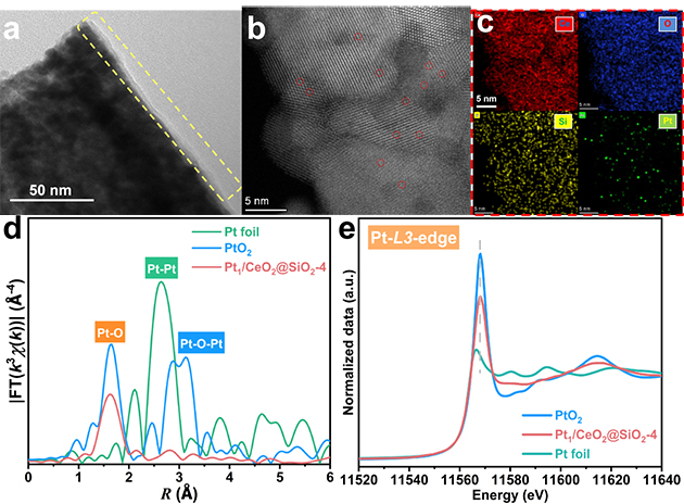 圖1.?單原子Pt1/CeO2@SiO2催化劑的AC-HAADF-STEM圖和XAS圖