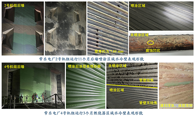 中國科學院蘭州化學物理研究所低碳能源材料組高祥虎研究員團隊近年來圍繞電站關鍵材料,專注于大型電站鍋爐輻射受熱面防護與節(jié)能增效關鍵技術研究。團隊研發(fā)的納米高熵防護與節(jié)能增效陶瓷涂層,突破了陶瓷材料防結焦、耐高溫腐蝕、紅外增效、高導熱率、熱膨脹系數(shù)可調(diào)等關鍵技術,同時具有降低煤耗、提高煤種適應性的多功能特點,可滿足大型調(diào)峰電站及其他常規(guī)電站的使用需求。在常樂電廠的大力支持下,該材料先后在其2號、4號機組開展應用。在爐膛服役1年后,使用了涂層材料的水冷壁管壁表面光滑致密、無結焦、附著物易清除、未出現(xiàn)凹坑和管壁減薄等腐蝕情況,表現(xiàn)出優(yōu)異的耐高溫腐蝕和防結焦性能。經(jīng)西安熱工研究院有限公司現(xiàn)場檢測,管壁厚度較噴涂前無明顯變化。對照相同區(qū)域未噴涂防護涂層的水冷壁表面均出現(xiàn)明顯的腐蝕凹坑,并附著有褐色的腐蝕產(chǎn)物。