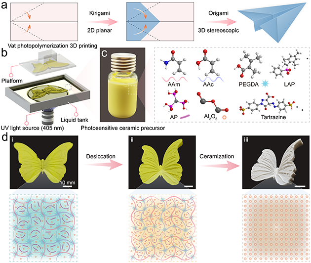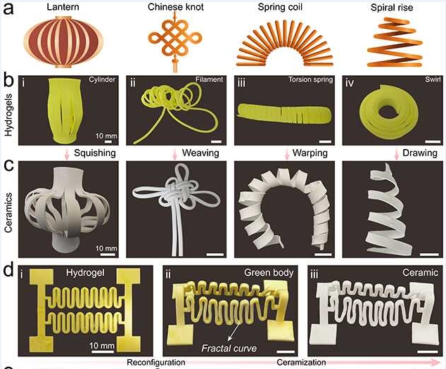 該團隊受折紙/剪紙藝術(shù)啟發(fā),以水性無機粘結(jié)劑磷酸二氫鋁(AP)溶膠為水凝膠單體分散介質(zhì),將水凝膠單體和納米陶瓷粉體混合來制備光敏性水凝膠陶瓷漿料;利用光固化3D打印獲得具有優(yōu)異的延展性、形狀適應(yīng)性、抗疲勞性且可二次變形的水凝膠柔性骨架;依次經(jīng)過脫水干燥、低溫脫脂和高溫?zé)Y(jié)等步驟,實現(xiàn)了具有超低收縮、高陶瓷產(chǎn)率和形狀保真度的懸空大跨度陶瓷結(jié)構(gòu)(圖1)。設(shè)計的柔性水凝膠基陶瓷前驅(qū)體能夠?qū)崿F(xiàn)從平面形狀到3D立體結(jié)構(gòu)的轉(zhuǎn)變,突破了傳統(tǒng)硬質(zhì)/脆性陶瓷前驅(qū)體來制造復(fù)雜陶瓷結(jié)構(gòu)的局限。