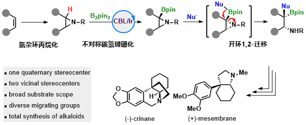 近日,該團(tuán)隊(duì)針對(duì)簡(jiǎn)單烯烴不對(duì)稱多官能團(tuán)化存在的問(wèn)題,利用其發(fā)展的CBL/銥催化體系,結(jié)合烯烴的氮雜環(huán)丙烷化/開環(huán)1,2-遷移硼化的組合策略,實(shí)現(xiàn)了簡(jiǎn)單烯烴的不對(duì)稱三官能團(tuán)化反應(yīng),高對(duì)映選擇性地實(shí)現(xiàn)了鄰位季碳中心的手性胺。同時(shí),利用該方法,團(tuán)隊(duì)首次實(shí)現(xiàn)了從廉價(jià)易得的環(huán)己烯到石蒜科生物堿(-)-crinane和(+)-mesembrane的對(duì)映選擇性全合成。