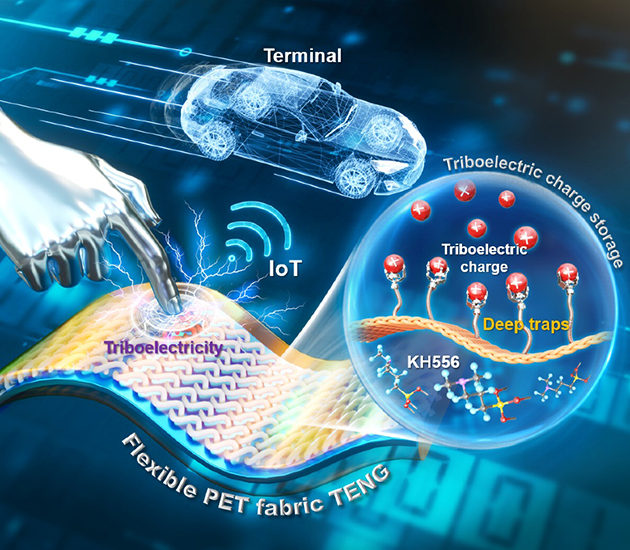 摩擦起電過程中產(chǎn)生的電荷會(huì)瞬時(shí)存儲(chǔ)在電介質(zhì)表面,進(jìn)而被兩種不同類型的陷阱(淺陷阱和深陷阱)捕獲。其中,淺陷阱中的電荷容易逸出,優(yōu)先耗散到環(huán)境中,而深陷阱中的電荷則因?yàn)闃O難逸出,可長期儲(chǔ)存。因此,影響摩擦層電荷耗散率的關(guān)鍵因素是陷阱捕獲電荷和被捕獲電荷的逃逸能力?;诖?,該團(tuán)隊(duì)通過系統(tǒng)研究,揭示了載流子深陷阱在摩擦電荷存儲(chǔ)中的機(jī)制,通過分子自組裝技術(shù)在織物摩擦層界面構(gòu)建載流子深陷阱的方式增加TENG的電輸出,將該織物TENG用于物聯(lián)網(wǎng)可穿戴電子設(shè)備的電源模塊,實(shí)現(xiàn)了對機(jī)械運(yùn)動(dòng)的穩(wěn)定控制。相關(guān)研究成果發(fā)表在Advanced Materials(2024,2303389)上。