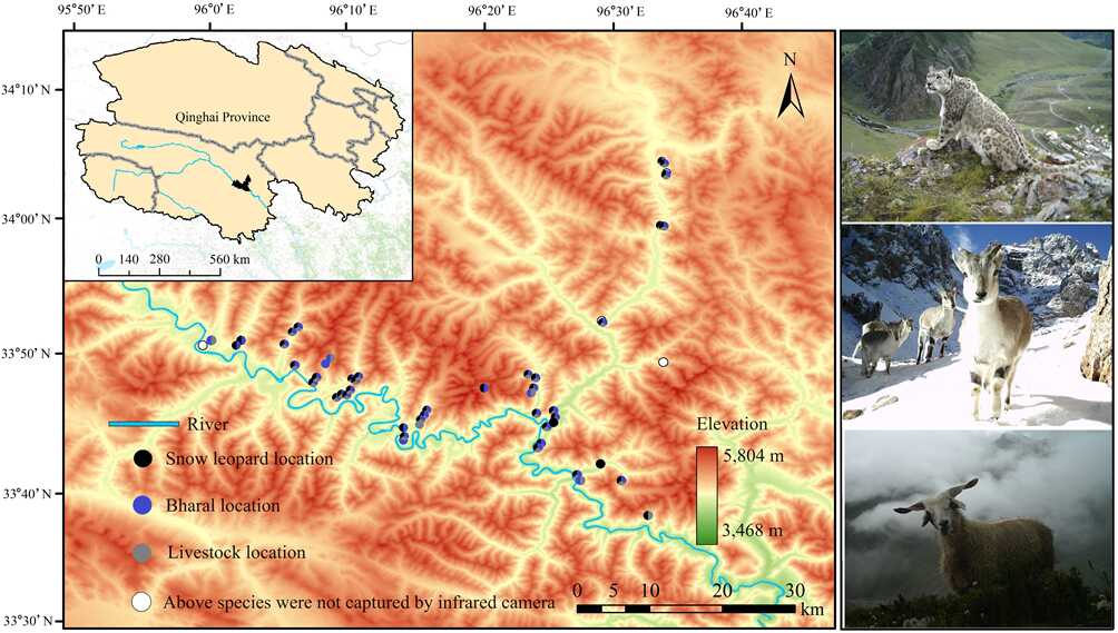 中國(guó)科學(xué)院西北高原生物研究所動(dòng)物生態(tài)與資源保護(hù)研究團(tuán)隊(duì)以人獸沖突較為嚴(yán)重的曲麻萊縣巴干鄉(xiāng)為研究地區(qū),利用調(diào)查問卷評(píng)估了當(dāng)?shù)啬撩駥?duì)雪豹襲擊家畜事件的態(tài)度,并結(jié)合紅外相機(jī)陷阱技術(shù)獲得了雪豹和其主要獵物巖羊(Pseudois nayaur)以及散養(yǎng)家畜的影像資料,進(jìn)而探討了三種(類)動(dòng)物的時(shí)空重疊。研究結(jié)果表明:?。?)雪豹主要在夜間捕食家畜,牧民因雪豹襲擊家畜事件的發(fā)生而對(duì)雪豹保護(hù)持消極態(tài)度;(2)巖羊和家畜的空間利用重疊度最高(OI?。健?.78),其次是雪豹和巖羊(OI = 0.75)以及雪豹和家畜(OI?。健?.75);(3)雪豹屬于典型的夜行性動(dòng)物,而巖羊和家畜以晝間活動(dòng)為主。巖羊和家畜的日活動(dòng)節(jié)律模式高度一致,時(shí)間重疊指數(shù)最高(D?。健?.95),而雪豹和巖羊、雪豹和家畜的日活動(dòng)節(jié)律重疊指數(shù)較低(D = 0.51),且重疊時(shí)段主要集中于夜間。綜上所述,由于雪豹、巖羊和散養(yǎng)家畜之間存在較高的空間重疊,可能增加了家畜被雪豹捕食的機(jī)會(huì),同時(shí),家畜和巖羊活動(dòng)節(jié)律的高度重疊進(jìn)一步加劇了此類事件的發(fā)生幾率。基于研究結(jié)果,我們提出了針對(duì)性的保護(hù)和管理措施,例如規(guī)范放牧區(qū)域以減小家畜與雪豹的相遇幾率,加強(qiáng)對(duì)散養(yǎng)家畜的夜間管理以減少雪豹夜間肇事等。