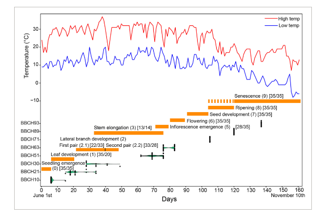 生長發(fā)育階段及其標志性發(fā)育事件的確認是開展遺傳學研究、建立表型變異和遺傳控制基因之間因果關(guān)系的重要前提條件。基于國際BBCH編碼系統(tǒng),課題組定義了9個沙蓬生長發(fā)育階段,涵蓋了整個生活史,明確了標志性發(fā)育事件,建立了沙蓬BBCH編碼系統(tǒng)。通過大田實驗,驗證了該編碼系統(tǒng)的可行性,量化了各個主要階段及其次級細分階段的時間持續(xù)范圍,為開展沙蓬種質(zhì)資源評價、分子遺傳學研究和遺傳馴化建立了生長發(fā)育時期轉(zhuǎn)換的表型參考標準。