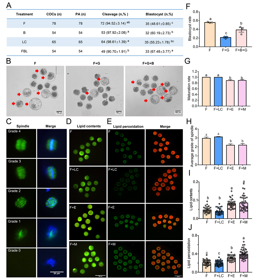 論文代表圖:A:關(guān)鍵代謝物肉毒堿與甜菜堿促進(jìn)綿羊卵母細(xì)胞的孤雌發(fā)育潛力;B和F: 甜菜堿可挽救滲透應(yīng)激的下綿羊胚胎的發(fā)育潛力;C、G和H: 肉毒堿可促進(jìn)卵母細(xì)胞成熟和調(diào)控紡錘體形態(tài);D、E、I和J:肉毒堿可降低卵母細(xì)胞內(nèi)脂質(zhì)含量和脂質(zhì)過(guò)氧化水平。