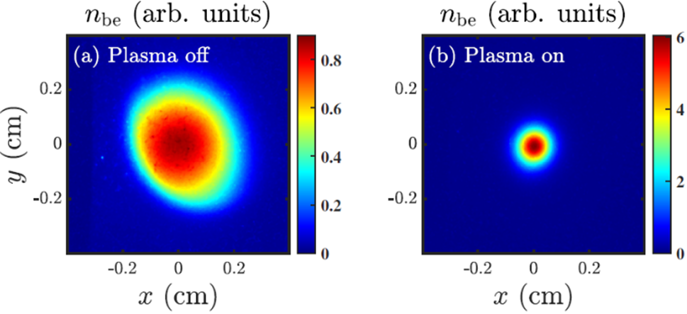 實(shí)驗(yàn)中,基于高能電子成像實(shí)驗(yàn)平臺(tái),科研人員利用熱陰極微波電子槍產(chǎn)生的電子束及高壓直流放電等離子體靶,成功觀察到電子束在有源等離子體透鏡中的聚焦現(xiàn)象,同時(shí)對(duì)其聚焦原理深入分析。實(shí)驗(yàn)結(jié)果表明(圖1):當(dāng)?shù)入x子體靶不放電時(shí),YAG屏上的束斑為1.25 mm,而該靶調(diào)節(jié)至合適的放電電壓和氣壓后,束斑減小至0.48mm,聚焦效果顯著!