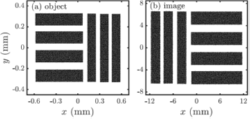 鑒于有源等離子體透鏡具有緊湊、聚焦梯度大、對(duì)稱(chēng)聚焦、色差小的優(yōu)勢(shì),科研人員將該透鏡成功應(yīng)用到高能電子成像中。從高能電子束在透鏡中的傳輸矩陣出發(fā),科研人員設(shè)計(jì)了一個(gè)總長(zhǎng)為44.87cm、放大倍數(shù)為20的高能電子成像系統(tǒng),其點(diǎn)對(duì)點(diǎn)成像模擬結(jié)果如圖2所示。模擬結(jié)果表明:該系統(tǒng)的成像分辨率可以達(dá)到亞微米量級(jí),相較于基于電磁四極鐵的全長(zhǎng)為5m(放大倍數(shù)為10)的成像系統(tǒng)十分緊湊。