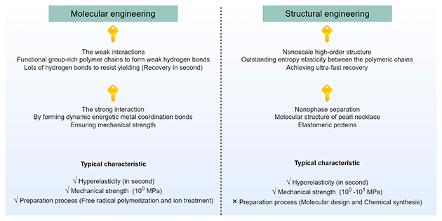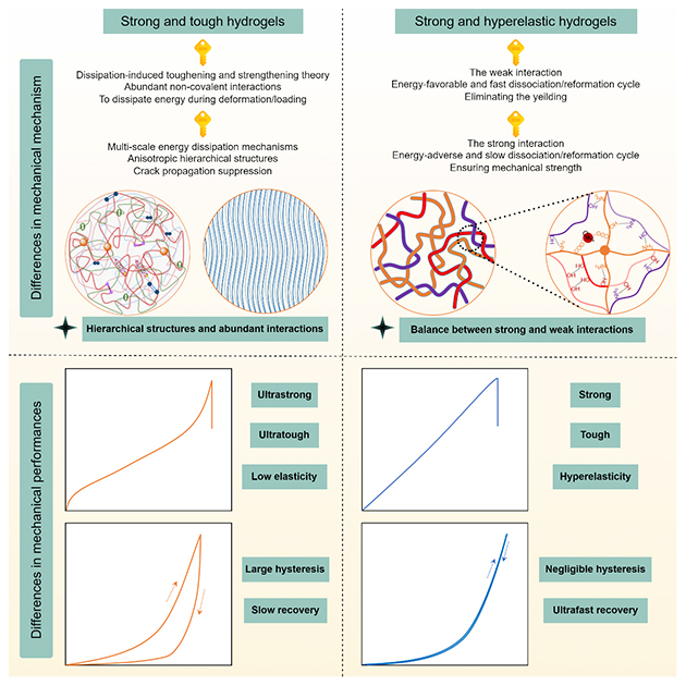 圖1. 強韌水凝膠和超彈性水凝膠在力學機制和性能方面的差異