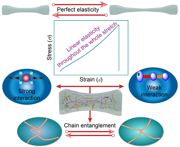 近二十年,聚合物凝膠,尤其是水凝膠,其力學強度、韌性、疲勞和黏附等性質的調控和提升已取得巨大進步,體現(xiàn)在先進的力學機制和構造方法。然而,在力學強度和完美彈性之間尋求權衡仍是一個挑戰(zhàn)。