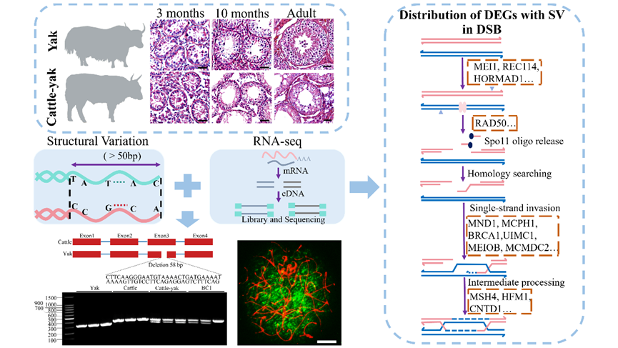 中國科學院西北高原生物研究所動物生態(tài)與資源保護研究團隊通過整合牦牛和普通?;蚪MSV位點信息和轉(zhuǎn)錄組數(shù)據(jù),對牦牛、犏牛和回交一代(BC1)睪丸組織在幾個關(guān)鍵發(fā)育階段的組織學特征、轉(zhuǎn)錄組圖譜以及SV在差異表達基因(DEGs)中的分布進行了表征。結(jié)果發(fā)現(xiàn),在犏牛睪丸組織中,與精原細胞命運決定、減數(shù)分裂重組和DSB修復等過程相關(guān)的基因表達下調(diào),且在每個發(fā)育階段犏牛中均有一定比例的DEGs含有SV。比如,3月齡犏牛27.78%的DEGs(50/180)中分布有180個SV,其中大部分SV(147/180)位于內(nèi)含子區(qū);10月齡犏牛27.73%的DEGs(1750/6310)中分布有8741個SV,其中大部分SV位于內(nèi)含子區(qū)(7640/8741),少量的SV位于外顯子區(qū)(50/8741)和UTR區(qū)(18/8741)等,這些SV可能會影響基因的表達。對其中的候選基因ESCO2和BRDT進行了表達驗證,發(fā)現(xiàn)ESCO2在牦牛和犏牛精母細胞細線期表達,BRDT在牦牛精母細胞偶線期和粗線期表達,但在犏牛中只在偶線期表達。相較于牦牛,犏牛中ESCO2和BRDT的表達均下調(diào)。此外,還發(fā)現(xiàn)差異表達的X連鎖基因在10月齡(123/252)和成年(206/274)的犏牛中多數(shù)表達上調(diào),這可能與減數(shù)分裂性染色體失活(MSCI)異常有關(guān),凸顯了 X 染色體在雜交不育中的作用。然而,相較于犏牛無法產(chǎn)生精子,BC1曲細精管中出現(xiàn)了少量的圓形精子,并且與精子形成相關(guān)的基因(TSSK6, TSKS, TBC1D21, TPPP2, SPPL2C等)表達上調(diào),但仍低于牦牛正常精子發(fā)生水平,表明精子發(fā)生缺陷和基因表達異常在BC1中得到了部分恢復。本研究獲得了牦牛和犏牛在關(guān)鍵發(fā)育階段的DEGs 和SV位點信息,為了解SV在犏牛雄性不育以及物種雜交不育中的潛在功能提供了啟示。