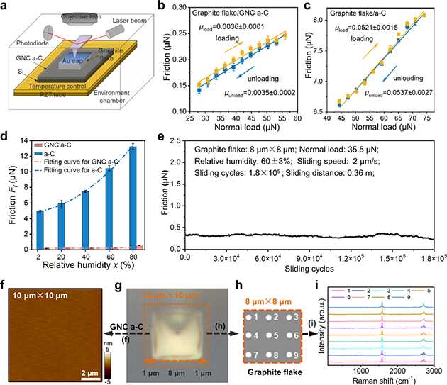 近日,研究人員針對(duì)固體表面濕度敏感、超潤(rùn)滑跨尺度易失效等基礎(chǔ)科學(xué)問(wèn)題開(kāi)展系統(tǒng)研究?;谖墨I(xiàn)調(diào)研,發(fā)現(xiàn)固體表面濕度敏感源于磨損后暴露的新表面,導(dǎo)致與水分子作用強(qiáng)烈的化學(xué)斷鍵形成。研究人員提出了運(yùn)動(dòng)界面“(近似)無(wú)磨損無(wú)化學(xué)反應(yīng)”思路,通過(guò)磁控濺射物理氣相沉積技術(shù),制備石墨烯覆蓋表面的納米結(jié)構(gòu)碳薄膜,構(gòu)建碳薄膜/微觀石墨島體系,實(shí)現(xiàn)了穩(wěn)健、濕度不敏感超潤(rùn)滑(即相對(duì)濕度2-80%下均實(shí)現(xiàn)超滑)。鑒于界面近似無(wú)磨損特性,該體系表現(xiàn)出結(jié)構(gòu)性超潤(rùn)滑性質(zhì)。