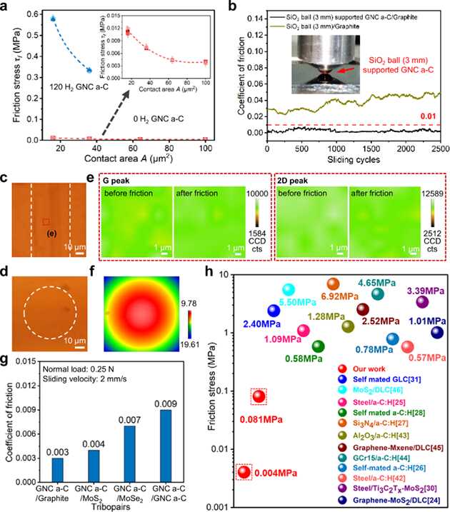 同時(shí),研究人員發(fā)現(xiàn)碳薄膜表面石墨烯片段之間彼此排列角度各異、呈現(xiàn)出無(wú)序性。這種結(jié)構(gòu)無(wú)序性誘導(dǎo)與石墨表面之間非公度性,加之薄膜整體成型制備避免了石墨烯邊緣暴露,有效減弱了阻礙結(jié)構(gòu)超潤(rùn)滑放大的邊緣效應(yīng),從而通過(guò)石墨島尺度逐級(jí)增加,實(shí)現(xiàn)了濕度不敏感超潤(rùn)滑跨尺度放大。本研究也存在不足,近似無(wú)磨損的設(shè)計(jì),限制了體系承載性等性能的提高。