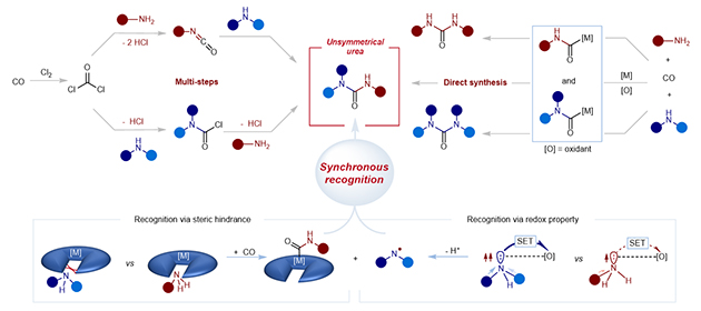 如何基于不同胺物理化學性質的細微差異,讓兩種不同胺片段找準位置,連接在同一羰基位點,一步合成非對稱脲是一個挑戰(zhàn)性難題。中國科學院蘭州化學物理研究所低碳催化與二氧化碳利用重點實驗室何林研究員團隊與武漢大學雷愛文教授團隊合作,提出了同步胺識別的概念,在鈷催化中心,當一級胺與二級胺共存時,僅有一級胺發(fā)生羰化生成?;锓N,表現(xiàn)出鈷物種對一級胺的選擇性識別;在銅催化中心,一級胺與二級胺與銅相互作用過程中,二級胺能夠快速生成自由基物種,表現(xiàn)出銅物種對二級胺的傾向性識別。首創(chuàng)性利用上述識別效應,在胺氧化羰基化一個催化反應中融合親核羰基化半反應與自由基生成轉化半反應全新反應機制,獲得了一步合成非對稱脲的獨特反應窗口。