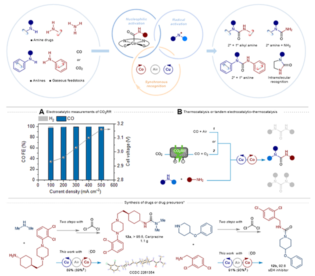 (A)底物適用范圍。(B)從CO2出發(fā)經(jīng)由CO合成非對稱脲的電熱耦合過程。(C)小分子成藥非光氣路線合成。