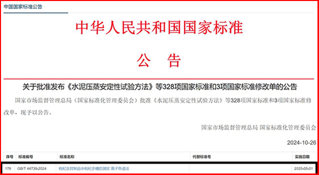 該團隊自2019年起,以枸杞多糖為研究對象,開展了枸杞多糖含量分析新方法的研究和國家標準的制訂。10月26日,由蘭州化物所牽頭、寧夏回族自治區(qū)藥品檢驗研究院等單位參與制訂的國家標準《枸杞及其制品中枸杞多糖的測定 離子色譜法》(GB/T 44739-2024),由國家市場監(jiān)督管理總局(國家標準化管理委員會)批準發(fā)布,將于2025年5月1日正式實施。