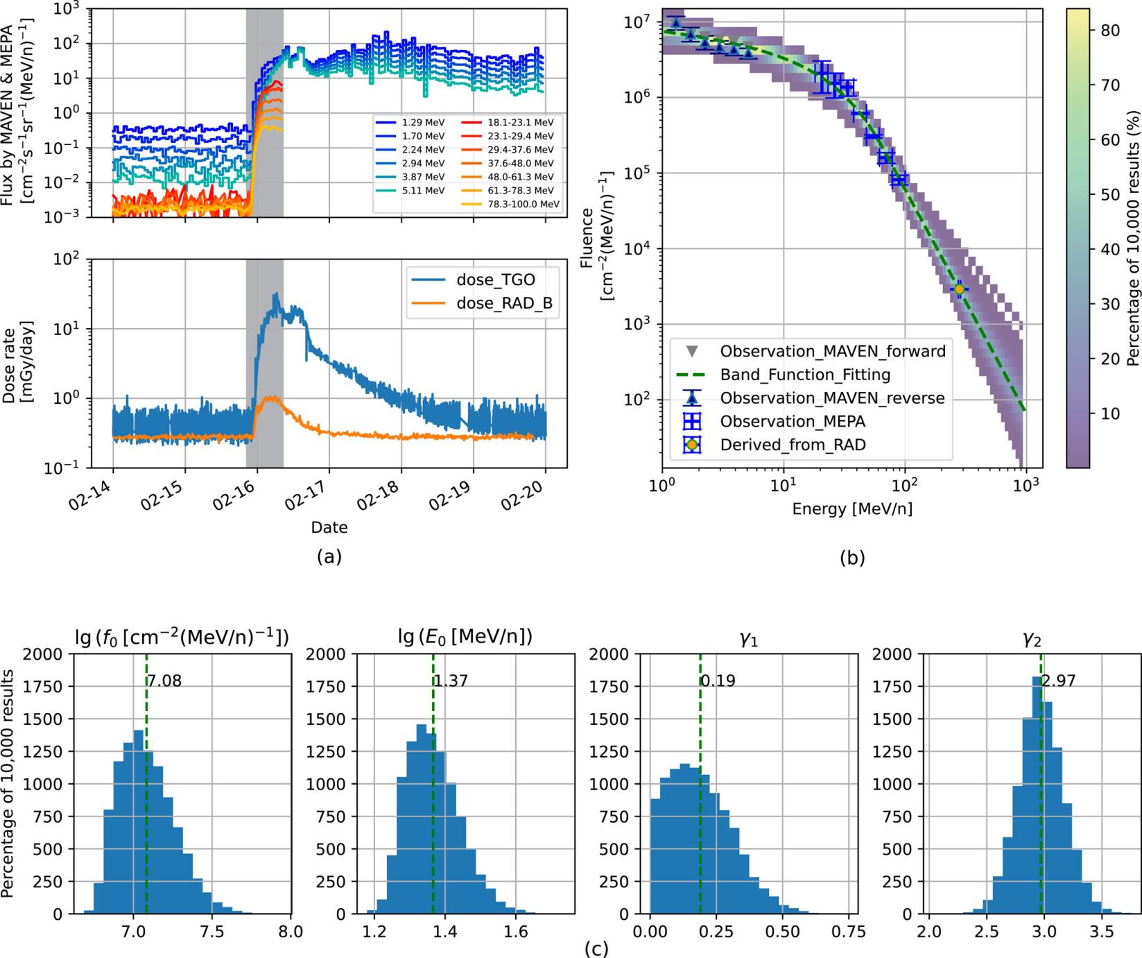本研究使用了多個探測器數(shù)據來構建相關質子能譜。中低能段的質子能譜由能量粒子分析儀和美國高能粒子儀提供。更高能段的質子通量是團隊結合火星表面的輻射評估探測器和火星粒子傳輸模型模擬反演得到。研究團隊通過對上述觀測和反演的能譜進行擬合,得到了此次太陽高能粒子事件在火星空間1~1000MeV能量范圍內的完整質子能譜。
