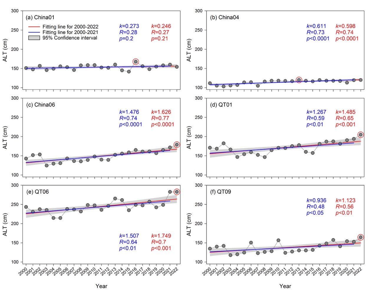 圖2 2000-2022年研究區(qū)6個(gè)活動層監(jiān)測點(diǎn)的活動層厚度的時(shí)間變化