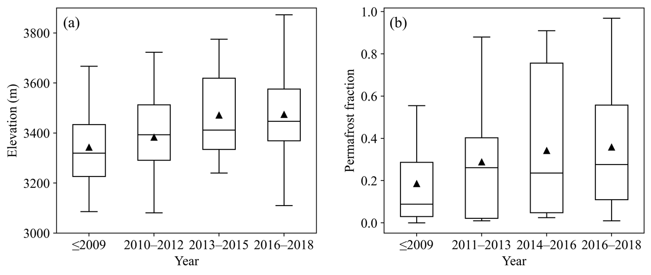 圖2:(a) 不同時期滑坡事件的海拔變化;(b) 滑坡事件對應(yīng)的多年凍土變化趨勢