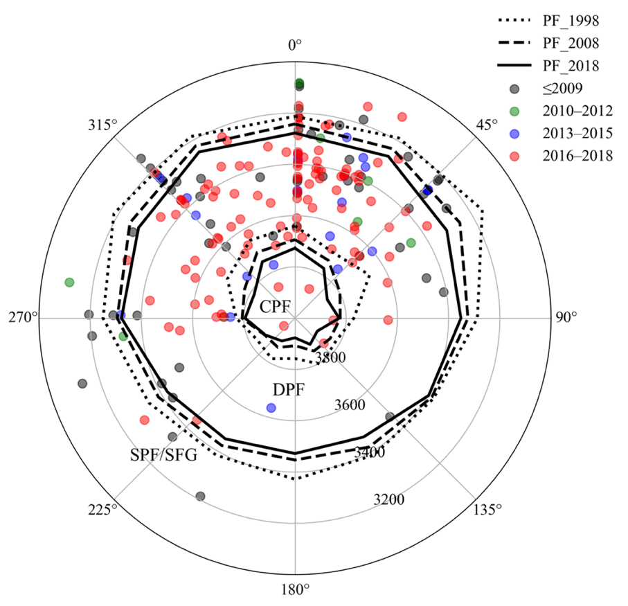 圖3:多年凍土邊界與滑坡的海拔、坡向和分布關(guān)系。三種不同線型分別代表1998年、2008年和2018年間稀疏多年凍土(SPF)、不連續(xù)多年凍土(DPF)和連續(xù)多年凍土(CPF)邊界的平均海拔。內(nèi)圈的三條線為SPF到DPF的過渡區(qū),外圈的三條線為DPF到CPF的過渡區(qū)。不同顏色的小圓點表示滑坡在各時間段的海拔、坡向和數(shù)量分布特征
