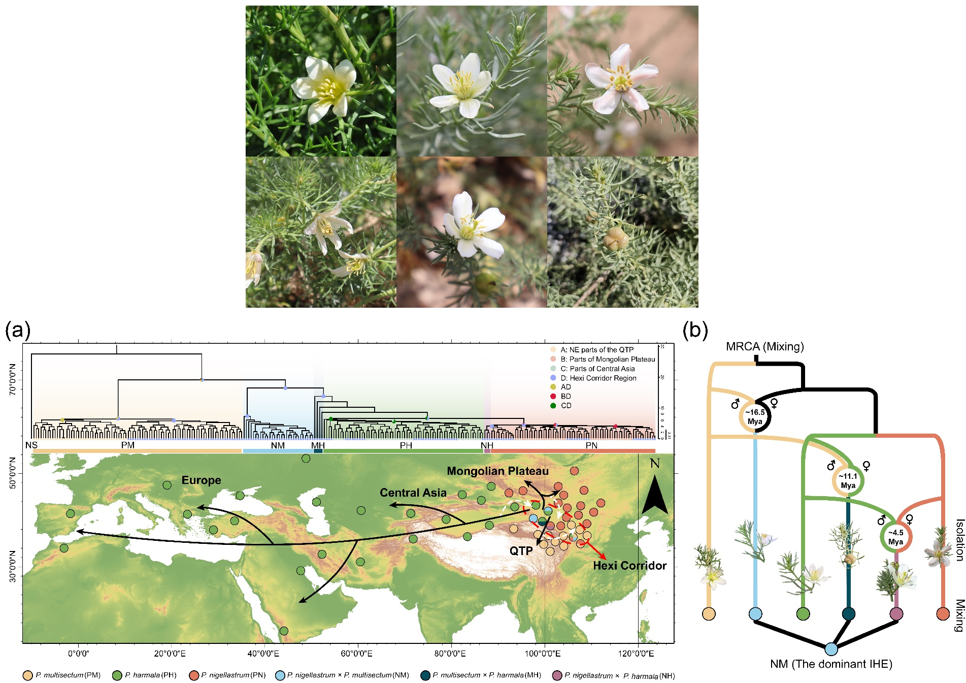 中國科學(xué)院西北高原生物研究所青藏高原植物適應(yīng)與進(jìn)化研究團(tuán)隊(duì)綜合利用Illumina二代測(cè)序、Oxford Nanopore三代測(cè)序及Hi-C互作圖譜技術(shù),成功構(gòu)建了多裂駱駝蓬的高質(zhì)量染色體水平參考基因組(2n=2x=24,基因組大小為314.37 Mb)?;谥衼喐珊祬^(qū)及其周邊地區(qū)的廣泛采樣,本研究對(duì)駱駝蓬屬及其中間形態(tài)類群的28個(gè)群體共284個(gè)個(gè)體進(jìn)行了全基因組重測(cè)序。研究結(jié)果表明,駱駝蓬屬起源于河西走廊地區(qū),通過擴(kuò)散作用和地理隔離形成了多裂駱駝蓬、駱駝?shì)锖婉橊勁畹漠愑蛭锓N形成。隨后,這些物種再次擴(kuò)散至河西走廊地區(qū),通過頻繁的基因交流演化出多種間斷雜交實(shí)體。本研究首次在中亞干旱區(qū)揭示了駱駝蓬屬的物種形成符合“混合-隔離-混合循環(huán)”(MIM cycles,Mixing-Isolation-Mixing cycles)的演化框架,解析了雜交物種形成的中間過渡階段。此外,研究發(fā)現(xiàn),間斷雜交實(shí)體通過基因交流繼承了親本的優(yōu)良性狀(如DNA損傷修復(fù)能力和抗旱適應(yīng)性),從而在自然選擇中表現(xiàn)出顯著的優(yōu)勢(shì)。通過對(duì)不同物種的轉(zhuǎn)錄組測(cè)序分析,進(jìn)一步驗(yàn)證了間斷雜交實(shí)體中與適應(yīng)性進(jìn)化相關(guān)的基因存在顯著差異表達(dá)。本研究通過對(duì)中亞干旱區(qū)駱駝蓬屬的系統(tǒng)性群體遺傳學(xué)研究,揭示了其獨(dú)特的物種形成模式,為雜交物種形成中間階段的研究提供了重要的模式類群,并為物種與雜交種間的適應(yīng)性進(jìn)化機(jī)制提供了新的理論依據(jù)。