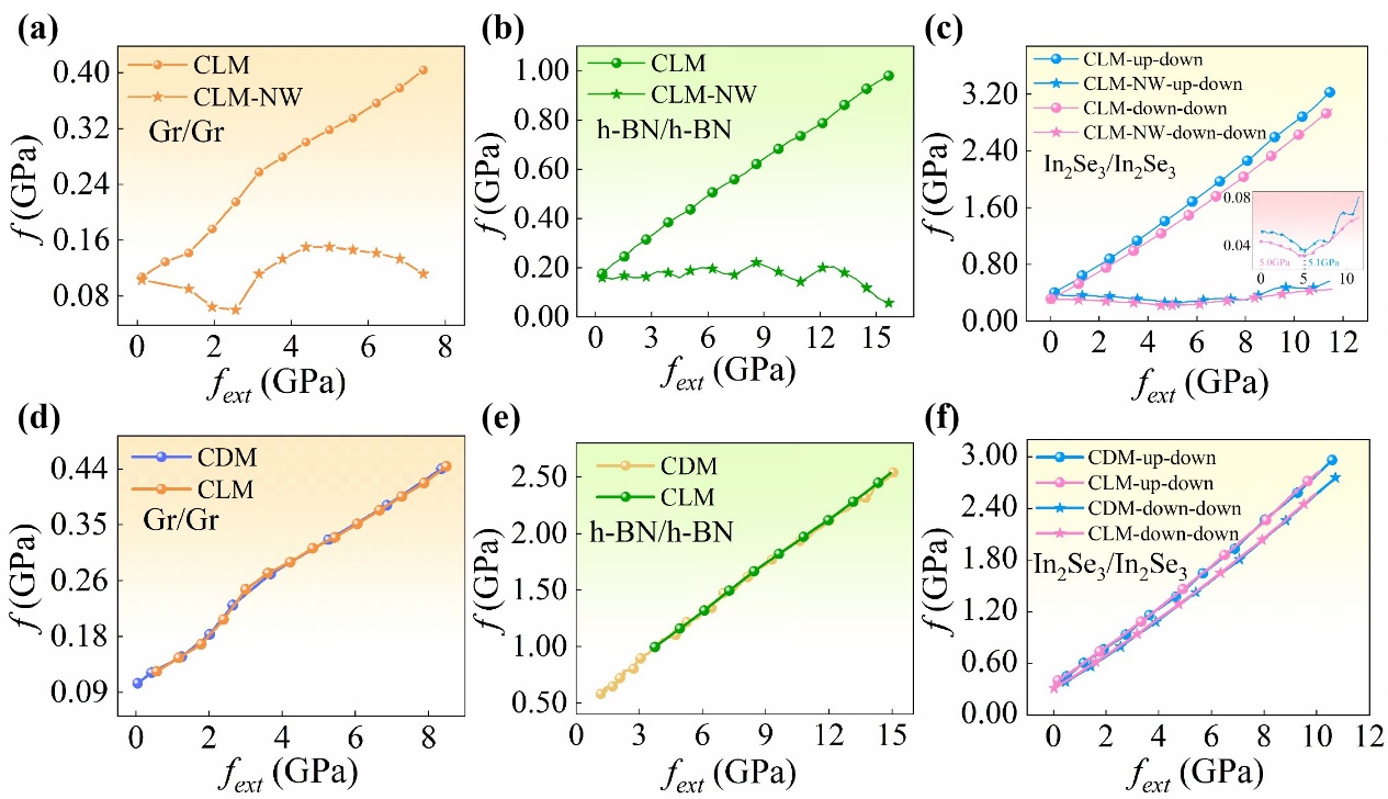 近日,中國科學(xué)院蘭州化學(xué)物理研究所潤滑材料全國重點(diǎn)實(shí)驗(yàn)室計算摩擦學(xué)課題組與蘭州交通大學(xué)材料科學(xué)與工程學(xué)院等單位合作,使用自主搭建的固體界面摩擦性能第一性原理高通量計算平臺LICP-FPHTC-Platform ( 摩擦學(xué)學(xué)報42(2022)493;軟件著作權(quán)2021SR1172689),考慮目前主流的三種靜態(tài)摩擦性能計算模型——等距模型(CDM)、等載模型(CLM)、無負(fù)載做功的等載模型(CLM-NW),針對已報道了負(fù)摩擦系數(shù)的二維材料界面體系——Gr/Gr、h-BN/h-BN、In2Se3/In2Se3,研究了摩擦性能的計算結(jié)果對計算模型的依賴。結(jié)果表明,只有CLM-NW的計算模型出現(xiàn)了文獻(xiàn)報道的負(fù)摩擦系數(shù)現(xiàn)象,CDM和CLM的摩擦計算結(jié)果定量一致(圖1)。