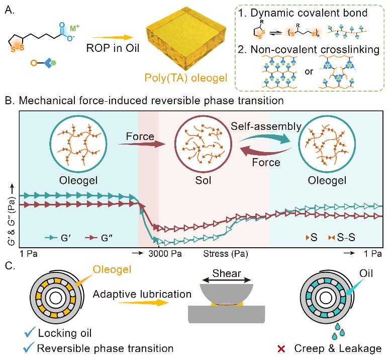 針對傳統(tǒng)潤滑油脂在新型高端裝備應用中面臨爬移、泄漏、粘滯阻力高等難以應對復雜多變工況的問題。近日,中國科學院蘭州化學物理研究所潤滑材料全國重點實驗室材料表面與界面研究組通過構筑具有機械力響應特性的動態(tài)共價網(wǎng)絡,開發(fā)了一類具有力誘導可逆相轉變能力的自適應油凝膠潤滑材料(PTA油凝膠)。PTA油凝膠可適應設備啟停,在溶膠或凝膠狀態(tài)保持和迅速轉換,且具有出色的潤滑穩(wěn)定性、適應不斷變化的運動工況。