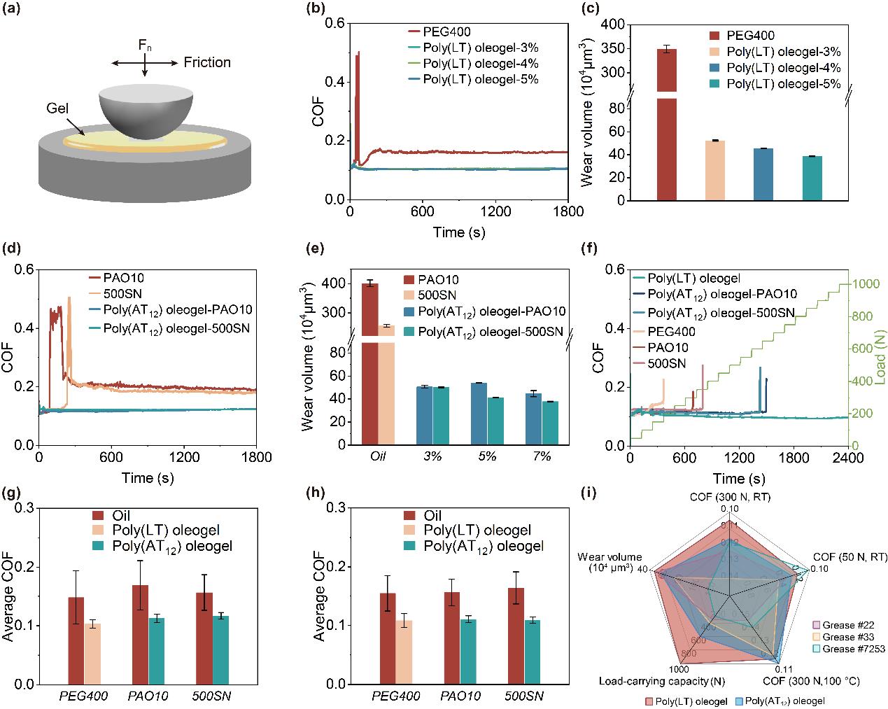 在極端和交變的摩擦條件下,PTA油凝膠表現(xiàn)出優(yōu)異的摩擦學性能和出色的潤滑穩(wěn)定性,進一步證實其對于惡劣、可變工況的適應性。通過與商用航空潤滑脂的系統(tǒng)對比,PTA油凝膠具有在多種測試條件下最為均衡的潤滑性能和最優(yōu)異的長期潤滑表現(xiàn)。
