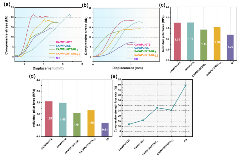 新型防凍固沙劑固結層在 27℃時的壓應力(a)和抗壓強度(c);-20℃凍融循環(huán)試驗后的壓應力(b)、抗壓強度(d)、抗壓強度損失率(e)