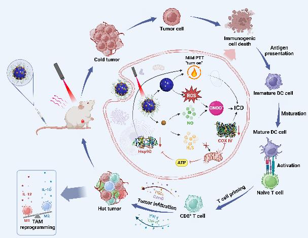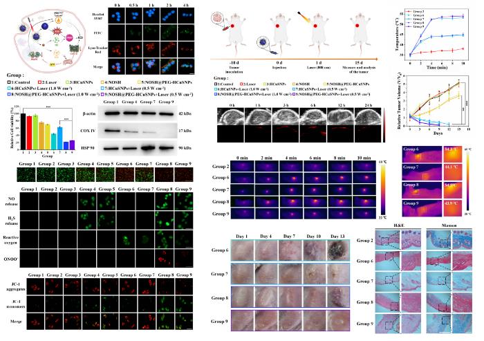 該研究利用雙模態(tài)探針和熒光-質(zhì)譜成像聯(lián)用動(dòng)態(tài)可視化技術(shù),揭示了三重協(xié)同抗腫瘤的作用機(jī)制。結(jié)果表明,利用納米馬達(dá),通過(guò)中空硫化銅納米顆粒HCuSNPs負(fù)載氣體信號(hào)分子供體NOSH,在808 nm激光照射下可控釋放H?S/NO,同時(shí)高效轉(zhuǎn)換光能(光熱轉(zhuǎn)化效率達(dá)27.8%),確保局部溫度維持在45℃以下,既能殺傷腫瘤細(xì)胞,又避免正常組織損傷。此外,該納米馬達(dá)不僅通過(guò)H?S阻斷線粒體能量代謝、NO-ROS反應(yīng)生成ONOO?雙路徑誘導(dǎo)腫瘤凋亡,還可顯著重塑腫瘤免疫微環(huán)境,促進(jìn)M1型巨噬細(xì)胞極化(比例提升3倍)、CTLs浸潤(rùn)(增加5倍),全面提升免疫抗癌能力。