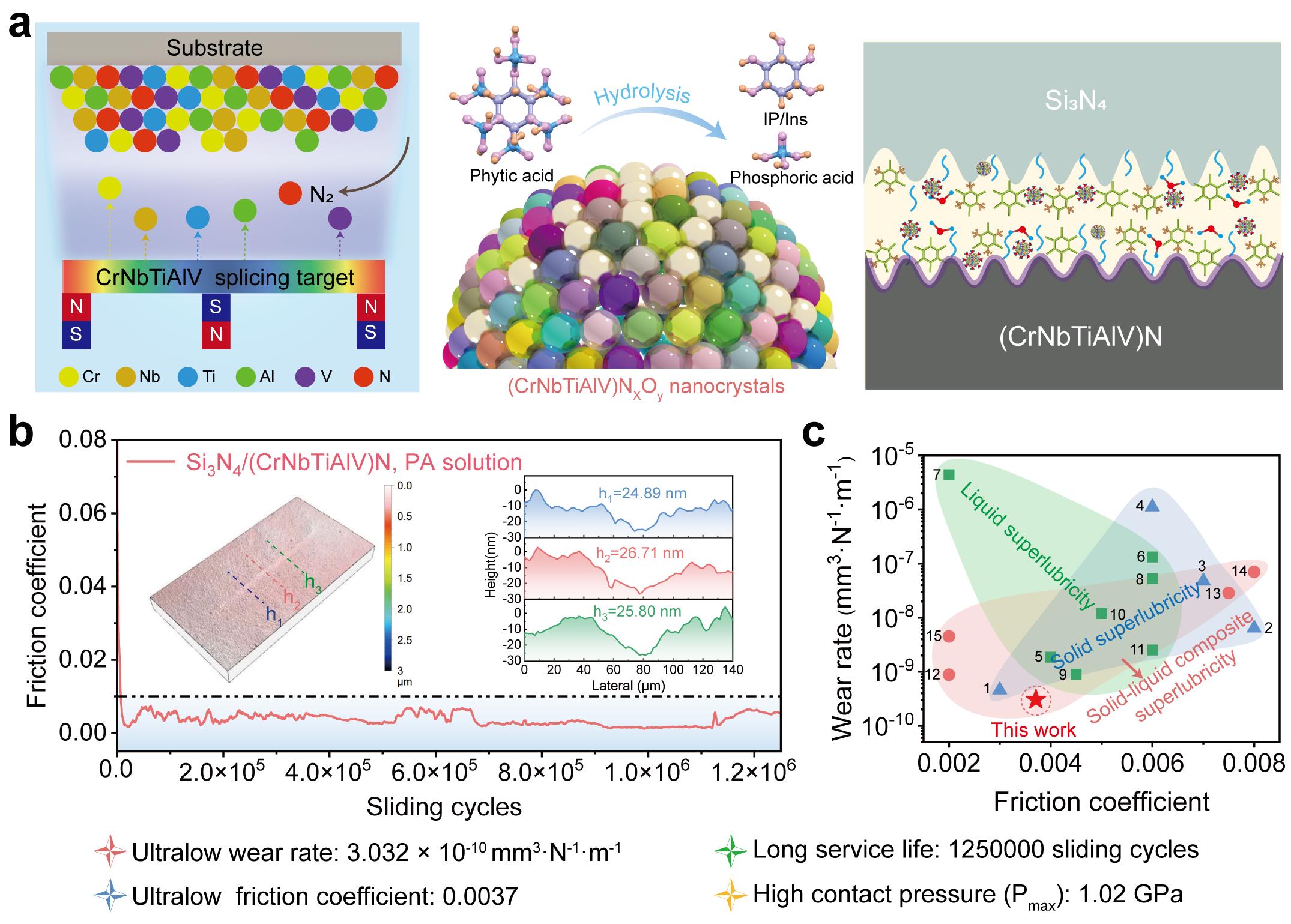 雖然水基超潤滑材料具有諸多優(yōu)勢,但其對金屬摩擦副的腐蝕問題會影響超潤滑狀態(tài)的長期穩(wěn)定性。為此,中國科學院蘭州化學物理研究所潤滑材料全國實驗室研究團隊近期提出了一種基于摩擦催化效應的“固-液復合超潤滑”策略,基于天然有機酸植酸和高熵陶瓷涂層的協(xié)同作用實現(xiàn)了優(yōu)異的減摩抗磨性能,有效地避免了水基潤滑劑的腐蝕問題。通過磁控濺射技術在軸承鋼表面沉積了(CrNbTiAlV)N高熵陶瓷薄膜(圖1),表現(xiàn)出優(yōu)異的力學性能并提供了豐富的反應位點。此外,在摩擦過程中高熵陶瓷表面還形成了一層鈍化層,可有效防止水基潤滑劑對鋼基體的腐蝕。