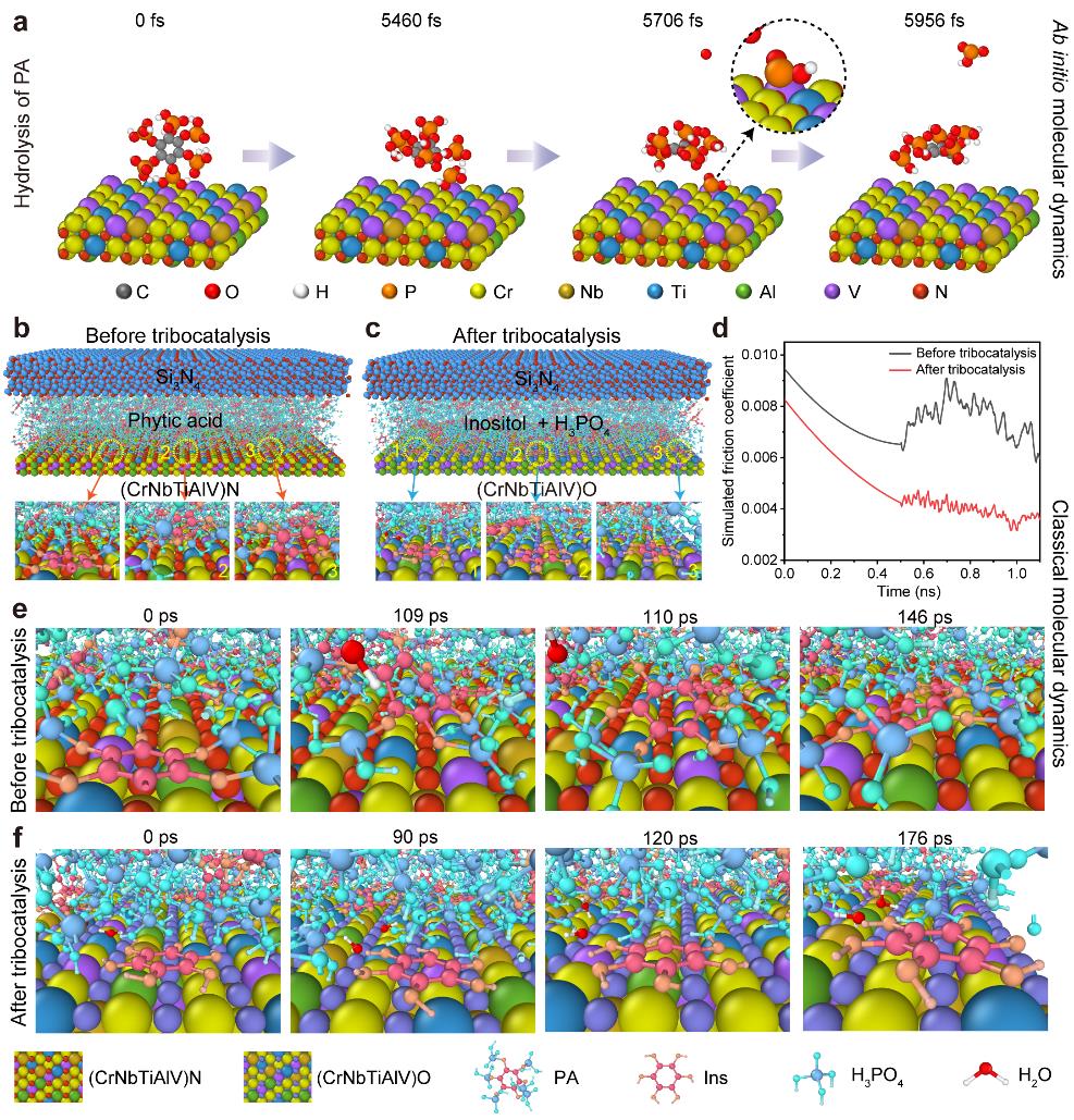 經(jīng)測試,該固-液復合超潤滑體系可在125萬次往復摩擦循環(huán)中持續(xù)保持超潤滑狀態(tài),摩擦系數(shù)低至0.0037,磨損率約為3.032×10?10mm3/(N·m)。摩擦過程中原位形成了平均粒徑約為7.3nm的高熵陶瓷納米晶體,這些納米晶體促進了植酸分子的水解,生成了肌醇多磷酸(或肌醇)和磷酸分子。通過分子動力學模擬進一步證明,肌醇和磷酸在滑動過程中可有效降低摩擦阻力,從而在宏觀尺度上實現(xiàn)固-液復合超潤滑(圖2)。該研究證實了摩擦催化效應在超潤滑中的作用,為設計高性能固-液復合超潤滑系統(tǒng)提供了新策略。