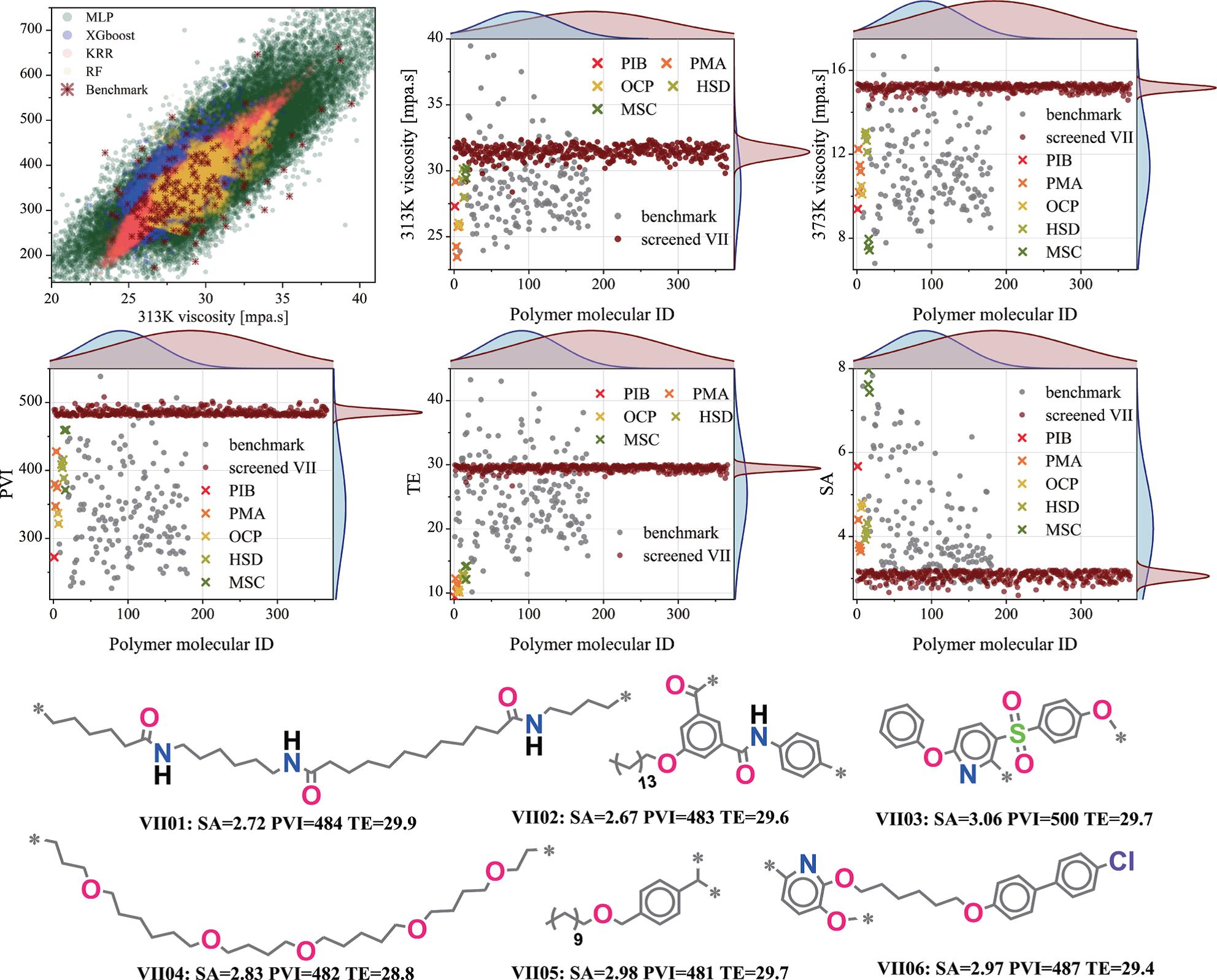 中國(guó)科學(xué)院蘭州化學(xué)物理研究所潤(rùn)滑材料全國(guó)重點(diǎn)實(shí)驗(yàn)室材料表面界面團(tuán)隊(duì)長(zhǎng)期致力于潤(rùn)滑油材料的分子模擬工程和人工智能設(shè)計(jì)研究。近期,研究人員融合高通量分子動(dòng)力學(xué)模擬與可解釋人工智能的自動(dòng)化材料設(shè)計(jì)框架,破解了潤(rùn)滑油核心添加劑——黏度指數(shù)改進(jìn)劑(VII)研發(fā)難題。該研究通過(guò)自主開發(fā)的智能計(jì)算管道,僅從5類商用聚合物出發(fā),高效生成大規(guī)模VII數(shù)據(jù)集(1166組數(shù)據(jù)),并利用多目標(biāo)機(jī)器學(xué)習(xí)模型從180萬(wàn)候選分子中篩選出366種高性能聚合物,其粘溫性能超越現(xiàn)有商用產(chǎn)品。該工作有望為潤(rùn)滑油行業(yè)節(jié)省大量實(shí)驗(yàn)成本,驗(yàn)證數(shù)據(jù)稀缺領(lǐng)域“計(jì)算驅(qū)動(dòng)-模型解析-材料設(shè)計(jì)”的研發(fā)新范式,在高分子材料、藥物設(shè)計(jì)等領(lǐng)域具有廣泛推廣價(jià)值。