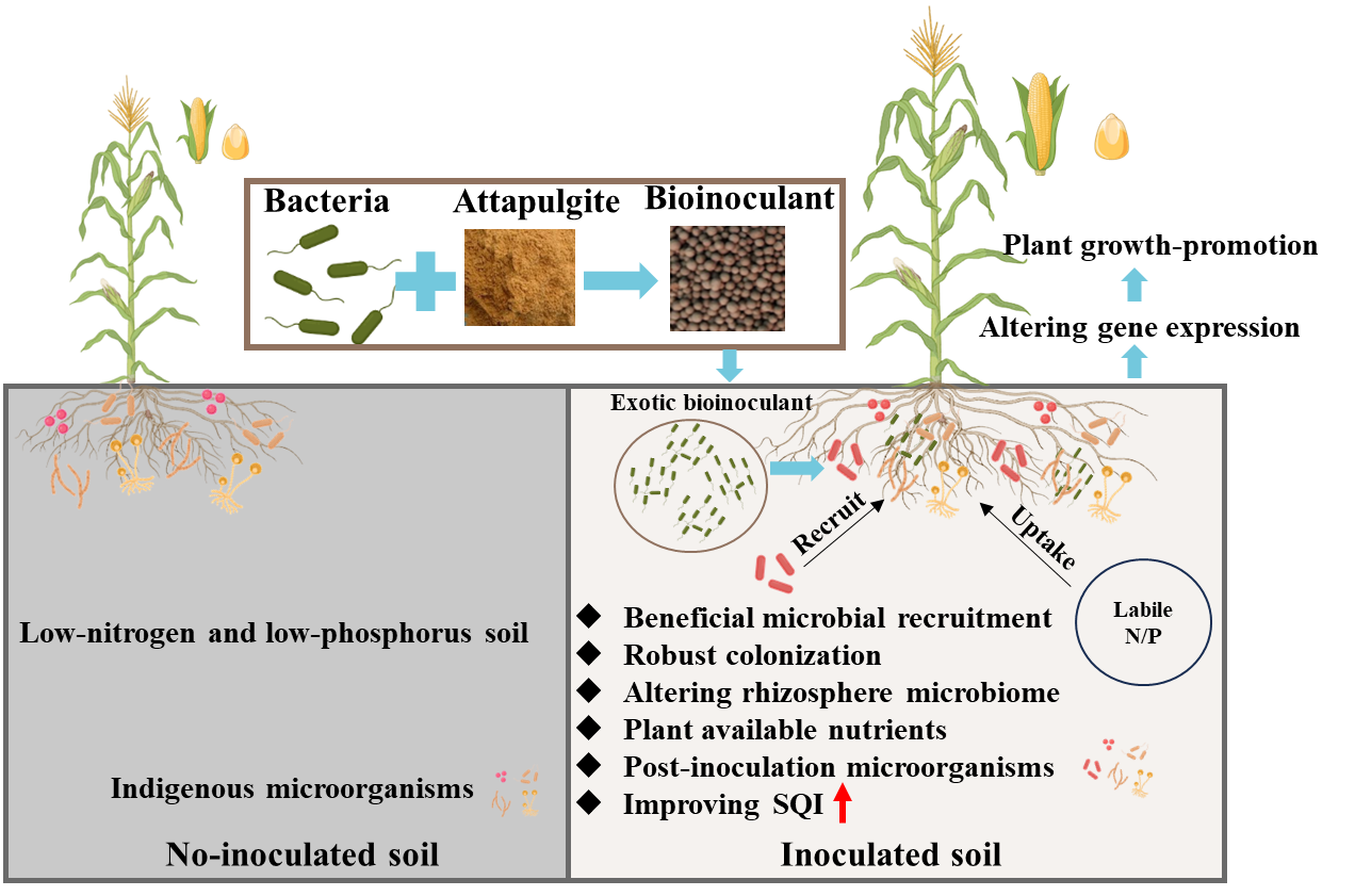 中國科學(xué)院西北生態(tài)環(huán)境資源研究院王若愚研究員團(tuán)隊(duì)與奧地利國家技術(shù)研究院的Angela Sessitsch教授和Günter Brader教授合作,系統(tǒng)揭示了固體顆粒微生物菌劑(貝萊斯芽孢桿菌Bacillus velezensis FZB42與粘土材料組成)通過調(diào)控根際微生物群落和玉米基因應(yīng)答,改善貧瘠堿性黃土質(zhì)量并促進(jìn)玉米生長的機(jī)制。研究設(shè)置了減施氮肥與不施磷肥的處理?xiàng)l件,探索了微生物菌劑在低外源肥料施用下,如何提高作物對土壤養(yǎng)分的吸收,進(jìn)而促進(jìn)增產(chǎn)的效果。