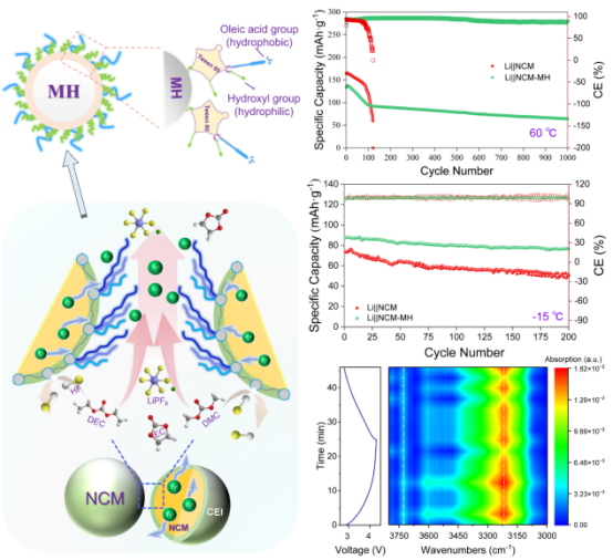 研究團(tuán)隊(duì)首先以Tween80為框架物質(zhì)構(gòu)建一種弱交聯(lián)柔性受限空間,電沉積獲得所需超細(xì)納米氫氧化鎂載體(D50=15 nm),并通過Tween80原位改性實(shí)現(xiàn)納米氫氧化鎂功能化。用所得材料對(duì)鋰電池三元正極材料(LiNi0.5Co0.2Mn0.3O2)進(jìn)行表面修飾,并進(jìn)行電池組裝和性能測試。原位紅外分析表明,Li?與 Tween80 分子間存在持續(xù)的配位和解離過程,使Tween80 分子荷電狀態(tài)發(fā)生動(dòng)態(tài)變化,并在電場作用下發(fā)生連續(xù)的構(gòu)型轉(zhuǎn)變,亦即“烷基鏈搖曳”行為。烷基鏈搖曳使得納米氫氧化鎂在電池循環(huán)伊始就參與反應(yīng),快速形成薄而致密的富鎂無機(jī)正極固態(tài)電解質(zhì)界面膜。這種膜熱穩(wěn)定性高、耐腐蝕性強(qiáng),能夠有效抵御高溫電解液攻擊。而在低溫環(huán)境下,電解液通常會(huì)在正極表面積聚,并常因流動(dòng)性差而阻礙鋰離子傳輸。此時(shí)烷基鏈搖曳可顯著促進(jìn)電解液的界面流動(dòng),兼之富鎂界面層具有優(yōu)異離子導(dǎo)電性,使鋰離子低溫傳輸變得非常順暢。研究結(jié)果表明,通過“烷基鏈搖曳”界面驅(qū)動(dòng)設(shè)計(jì),鋰離子電池可在60℃穩(wěn)定充放電1000圈以上,同時(shí)保持70 mAh/g容量和90%以上庫侖效率。在-5℃和-15℃分別循環(huán)500圈、200圈后,容量仍能保持在80 mAh/g以上。該研究在配備熱管控系統(tǒng)后,電池實(shí)際寬溫域性能有望進(jìn)一步提升。