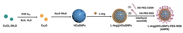 近日,中國科學(xué)院蘭州化學(xué)物理研究所天然藥物與化學(xué)測量研究中心海軍人才團(tuán)隊與新疆大學(xué)合作,針對傳統(tǒng)抗腫瘤藥物遞送系統(tǒng)的局限性,發(fā)展了一種“高效靶向+刺激響應(yīng)+光熱協(xié)同”智能響應(yīng)抗腫瘤藥物遞送材料。研究人員通過將一氧化氮供體L-精氨酸(L-Arg)負(fù)載到具有近紅外吸收的中空硫化銅納米顆粒(HCuSNPs)中,并與腫瘤靶向肽(RGD)組裝,合成AHPR智能納米遞送材料。體外和體內(nèi)實(shí)驗(yàn)表明,近紅外光激發(fā)下AHPR產(chǎn)生熱效應(yīng),誘導(dǎo)納米結(jié)構(gòu)降解并釋放銅離子和一氧化氮,提高血管通透性,促進(jìn)藥物深度滲透。同時,協(xié)同觸發(fā)光熱治療、銅死亡及活性氧/活性氮風(fēng)暴,實(shí)現(xiàn)高效抗腫瘤效果(體積減少90%)。