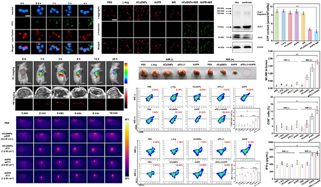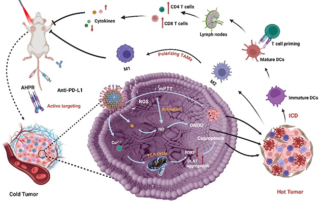 研究人員進(jìn)一步利用熒光-光聲成像可視化技術(shù),揭示了智能響應(yīng)抗腫瘤藥物遞送體系的作用機(jī)制。結(jié)果表明,AHPR組裝腫瘤靶向肽,可主動識別并富集于腫瘤部位,實(shí)現(xiàn)高效靶向遞送。并在近紅外光激發(fā)下,通過溫和光熱、銅死亡和ONOO?產(chǎn)生等機(jī)制調(diào)控腫瘤免疫微環(huán)境,促進(jìn)DCs成熟,增強(qiáng)T細(xì)胞的浸潤和巨噬細(xì)胞極化,誘導(dǎo)免疫原性細(xì)胞死亡,將“冷”腫瘤轉(zhuǎn)化為“熱”腫瘤。值得注意的是,AHPR可與免疫檢查點(diǎn)抑制劑(αPD-L1) 結(jié)合,進(jìn)一步增強(qiáng)免疫應(yīng)答率,改善腫瘤治療效果。這一策略為抗腫瘤藥物智能遞送材料開發(fā)和多維腫瘤免疫治療提供了新思路。